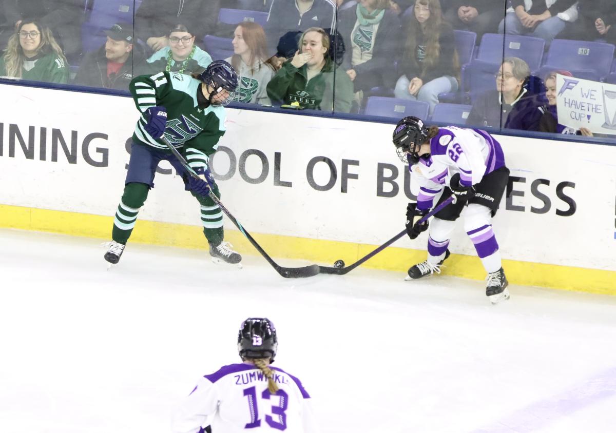 The game got off to a slow start scoring-wise, as the first period finished at a 0-0 tie. There were three penalties in the opening period, all committed by the Fleet. Luckily, the Fleet were able to fight them all off with strong penalty killing. Daniela Pejsova went off just 1:20 into the period with a Tripping call. Jessica Digirolamo and Emily Brown both went off later in the period on Interference and Delay of Game calls.